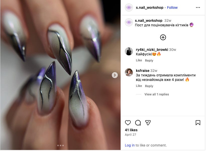The rest of the call drifted into nail science, discussions of UV/LED drying machines and the work she planned that day, painted geometries in micro-strokes that made me think of Ukrainian easter eggs.
